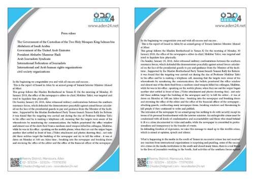في البدء نهديكم تحياتنا، ونتمنى للجميع التوفيق والنجاح، ونرفع إليكم هذا البلاغ الخاص بالاعتداء الذي تعرضت له صحيفة "عدن 24" الصادرة في عدن، من قبل مجموعة مسلحة تابعة لوزير الداخلية اليمنية أحمد الميسري، فجر يوم الإثنين الموافق 30 من يناير (كانون الثاني) 2018م، عقب استهداف مكتب رئيس التحرير الأستاذ مختار اليافعي ومحاولة تصفيته جسدياً.