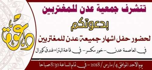 تدعو جمعية عدن للمغتربين جميع وسائل الإعلام لحضور تغطية حفل إشهار الجمعية غدا الأحد - الساعة التاسعة 9 صباحا في فندق كورال في قاعة البتراء بخور مكسر.