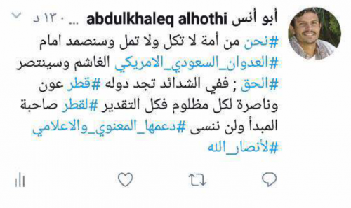 ووجه شكره للصحفي القطري المثير للجدل ورئيس تحرير صحيفة العرب القطرية عبدالله بن حمد العذبة الذي أساء للسعودية ودول التحالف وسخر من تضحياتهم.