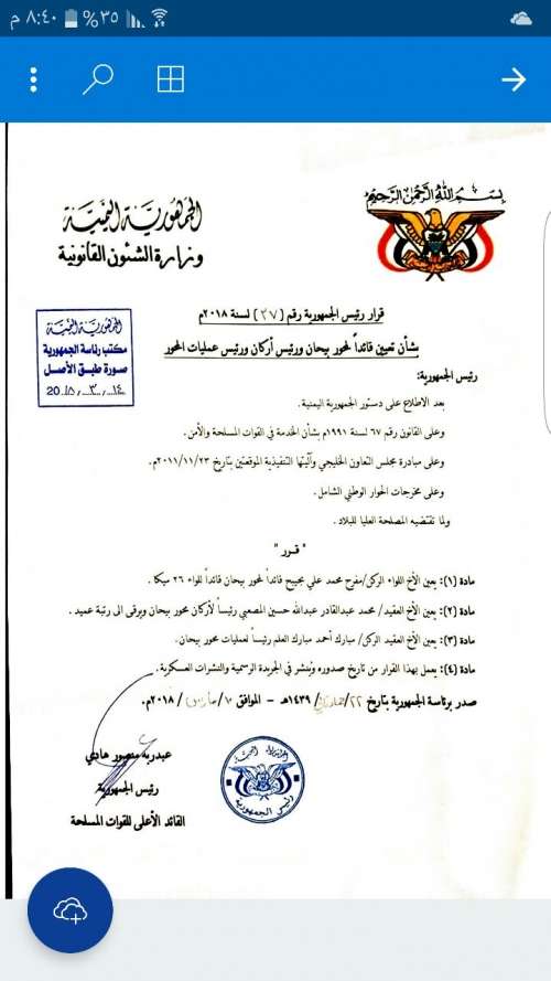 كما صدر القرار الجمهوري رقم ٣٧ لسـنة 2018م قضى بتعيين اللواء مفرح محمد علي بحيبح قائداً لمحور بيحان قائداً للواء ٢٦ وتعيين العقيد محمد عبدالقادر عبدالله حسين المصعبي رئيسا ً لأركان محور بيحان ويرقى إلى رتبة عميد ، وتعيين العقيد مبارك احمد مبارك المعلم رئيسا ً لعمليات محور بيحان .