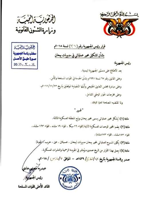 صدر اليوم القرار الجمهوري رقم ٣٦ لسـنة2018م والذي قضى بتشكيل محور عملياتي يسمى محور بيحان ويتبع المنطقة العسكرية الثالثة بمأرب، ويضم المحور الوحدات العسكرية التالية: (اللواء ٢٦ ميكا- اللواء ١٩ مشاة - اللواء ١٦٣ مشاة-اللواء١٥٣ مشاه - اللواء ١٧٣مشاه) ويكون مسرح المسرح العملياتي لمحور مديريات: ( بيحان - عسيلان-عين) جنوبا وحريب - الجوبة شمالا ) .