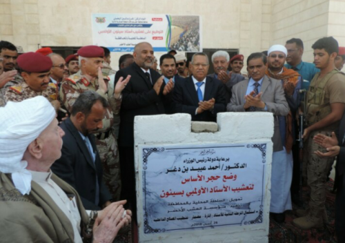 قام رئيس الوزراء الدكتور أحمد عبيد بن دغر ،اليوم، ومعه محافظ حضرموت قائد المنطقة العسكرية الثانية اللواء فرج سالمين البحسني وعدد من الوزراء ووكلاء المحافظة، بوضع حجر الأساس لمشروع تعشيب استاد سيئون الاولمبي بالنجيل الصناعي بكلفة نحو 400 مليون ريال كمرحلة أولى بتمويل حكومي.