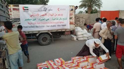 وزع فريق الهلال الأحمر الإماراتي أمس سلال غذائية على سكان حي الخبراء في خور مكسر بعدن و ذلك ضمن أنشطته في عام زايد 2018 وبمناسبة قدوم شهر رمضان المبارك.