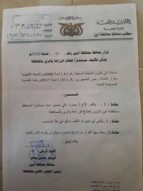 أصدر محافظ محافظة أبين اللواء الركن أبوبكر حسين القرار رقم (31) لعام 2018م والذي قضى بتكليف الشيخ حيدرة علي حسين دحة مستشارا للمحافظ لقطاع الزراعة والري بالمحافظة.