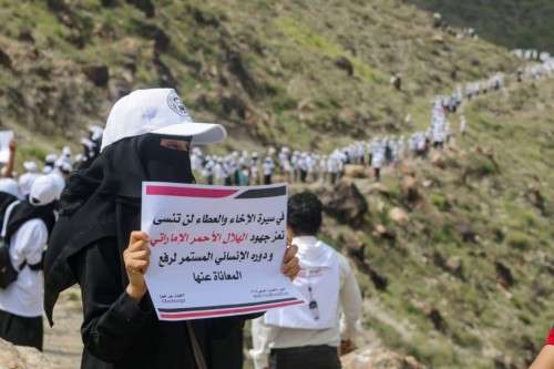 وتعاني تعز حصار عليها تفرضه مليشيا الحوثي الانقلابية على المواطنين مع استمرار قصف الأحياء السكنية واستهداف المدنيين بالقنص وزراعة لوحة بشرية فريدة للهلال الأحمر الإماراتي لإغاثة قرى تعز.
