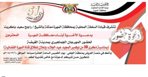 وتدعو السلطة المحلية بالمهرة للمشاركة الفاعلة في المهرجان والذي، يقان تحت رعاية كريمة من المشير الركن عبدربه منصور هادي رئيس الجمهورية القائد الأعلى للقوات المسلحة والأمن
