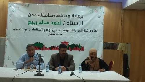 افتتح محافظ محافظ محافظة عدن أحمدسالم ربيع علي اليوم ورشة التوعية الخاصة بتحسين مستوى النظافة في مديريات محافظة عدن تحت شعار لاجلك ياعدن ..كلنا عمال نظافة .