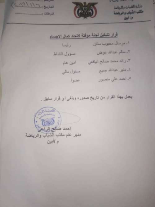 كما أصدر راعي رياضة أبين قرارا بتعيين لجنة مؤقتة لاتحاد كمال الأجسام من التالية اسمائهم :