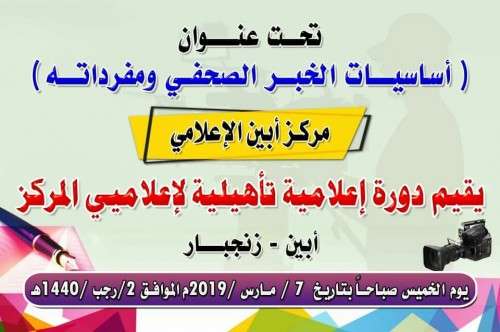 أقام اخوان اليمن الاصلاح اليوم الخميس دورة تأهيلية لعدد من الإعلاميين في محافظة أبين تحت عنوان : " أساسيات الخبر الصحفي ومفرداته " وذلك في قاعة مؤسسة المياه بمدينة زنجبار عاصمةالمحافظة ..