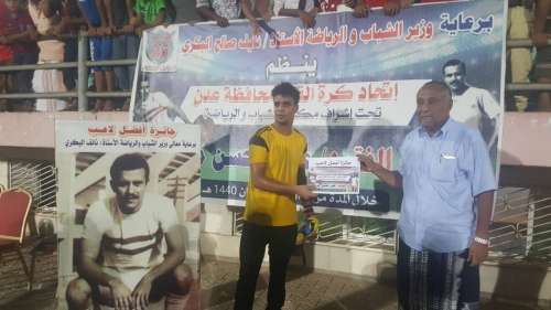 حارس مرمى الجلاء سالم وليد حصل على جائزة افضل لاعب في المباراة المقدمة من معالي الوزير نايف البكري سلمها مدير مكتب الشباب والرياضة بأبين أحمد الراعي .