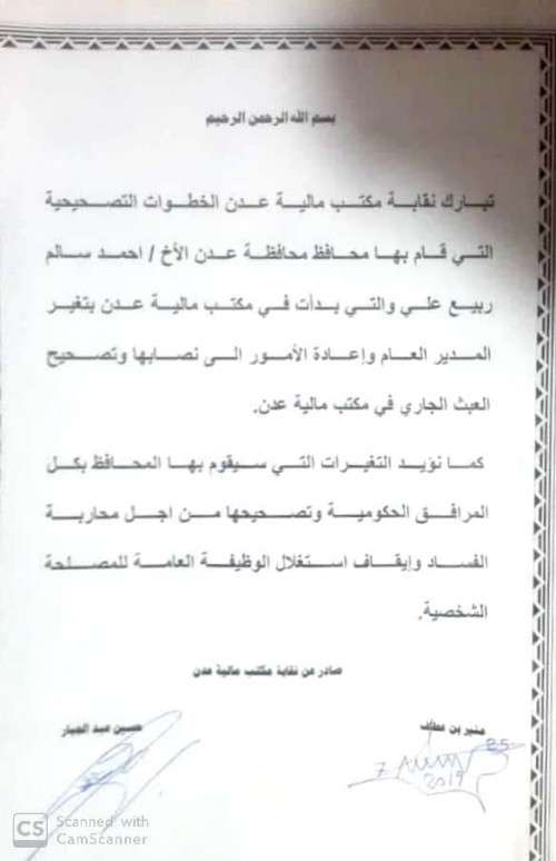 أصدرت نقابة مكتب مالية عدن بيان مباركة وتأييد لقرارات التصحيح الذي، يقوم بها محافظ عدن أحمد سالمين.