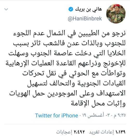 دعا نائب رئيس المجلس الانتقالي الجنوبي الشيخ هاني بن بريك في تغريدة له على التويتر المواطنين الشماليين إلى عدم اللجوء إلى الجنوب وبالذات محافظة عدن .
