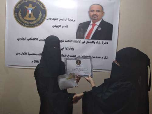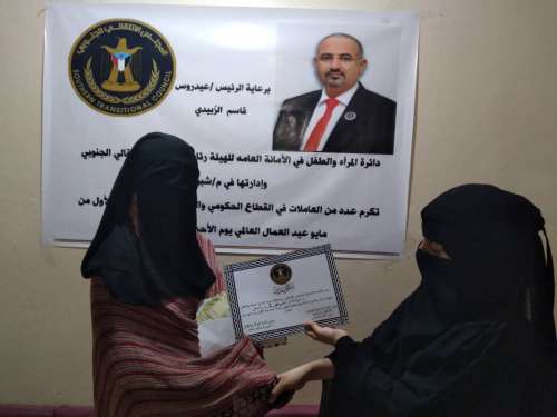 كرمت إدارة المرأة والطفل بالهيئة التنفيذية للقيادة المحلية للمجلس الانتقالي الجنوبي بمحافظة شبوة، ثلاث من العاملات المتميزات، وذلك بمناسبة يوم العمال العالمي، برعاية من الرئيس القائد عيدروس قاسم الزُبيدي.