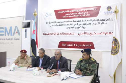 دشن مركز الإعلام العسكري للقوات المسلحة الجنوبية، بالتنسيق مع قطاع التدريب والتأهيل في الهيئة الوطنية للإعلام الجنوبي، اليوم السبت، دورة تدريبية لكوادر التوجيه المعنوي بعنوان "الإعلام العسكري والأمني.. خصوصياته، مزاياه، وأهميته"، برعاية الرئيس القائد عيدروس قاسم الزُبيدي رئيس المجلس الانتقالي الجنوبي، القائد الاعلى للقوات المسلحة الجنوبية.