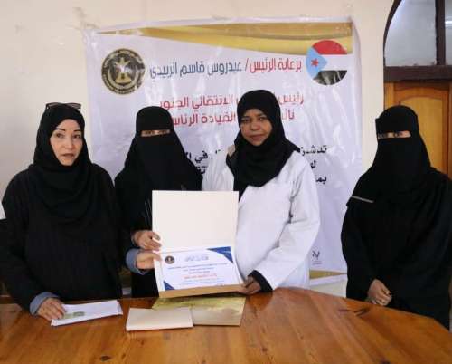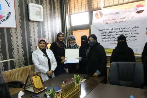 وقامت مساعد والعقربي، باسم المجلس الانتقالي ودائرة المرأة والطفل، بتكريم النساء الممرضات في مستشفى باصهيب تقديراً للجهود التي يقمن بها للتخفيف من معاناة الناس وللاهتمام بنزلاء المستشفى من الجرحى والمرضى.