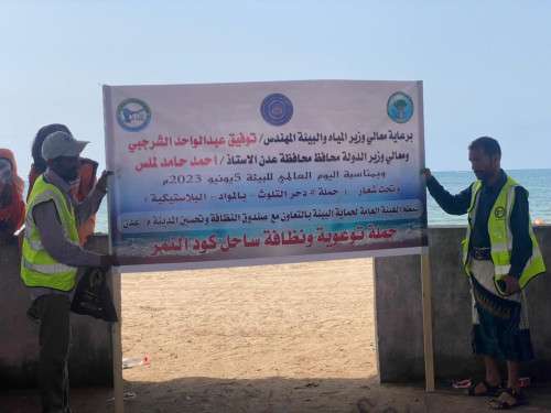 برعاية معالي وزير المياه والبيئة المهندس توفيق عبدالواحد الشرجبي ومحافظ محافظة عدن الاستاذ احمد حامد لملس دشن رئيس الهيئة العامة لحماية البيئة المهندس فيصل صالح الثعلبي بالتعاون مع صندوق النظافة وتحسين المدينة في العاصمة المؤقتة عدن في مديرية البريقة صباح اليوم الاثنين 5/6/2023م حملة توعوية ونظافة لساحل كود النمر.