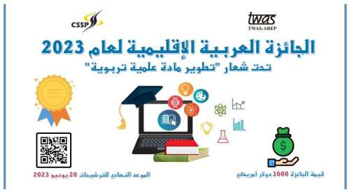 دعت وزارة التعليم العالي والبحث العلمي والتعلم الفني والتدريب المهني الجامعات والمؤسسات العلمية التي قدم باحثوها مساهمات في مجال (تطوير مادة علمية تربوية) تساعد على الارتقاء بجودة تعليم العلوم في المنطقة العربية، إلى الترشح للجائزة العربية الاقليمية لعام ٢٠٢٣.