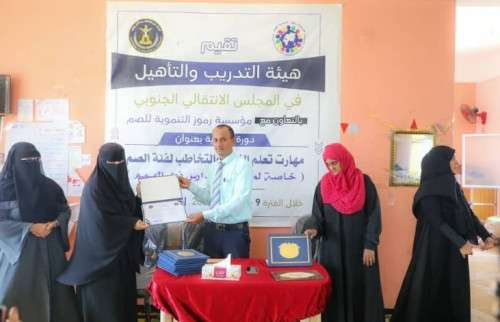 اختتمت هيئة التدريب والتأهيل في المجلس الانتقالي الجنوبي، اليوم الخميس، في العاصمة عدن، الدورة لتدريبية في "مهارات تعلم النطق والتخاطب لفئة الصم والبكم" لمعلمات مدارس ذوي الهمم، والتي أقيمت بالتعاون مع مؤسسة رموز التنموية.