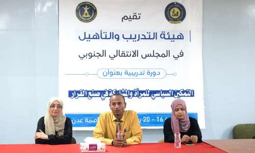 أقامت هيئة التدريب والتأهيل في المجلس الانتقالي الجنوبي، يوم الأحد، في مركز العلوم الإدارية بالعاصمة عدن، دورة تدريبية حول التمكين السياسي للمرأة والمشاركة في صنع القرار، لعدد من الكوادر النسائية في هيئات المجلس الانتقالي.
