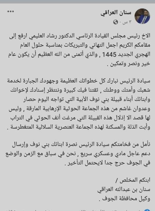 وقال العراقي في منشور له على صفحته في الفيس بوك: نأمل من فخامتكم سيادة الرئيس نصرة ابنائك بني نوف وإرسال دعم عاجل مادي وعسكري وسريع , نحن في سباق مع الزمن والوضع في الجوف حرج جدا لايحتمل التأخير.