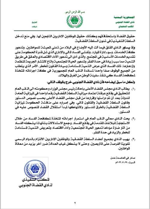 جاء ذلك في سياق البيان الصادر عن نادي القضاة الجنوبي ، اليوم ، والذي كان نصه على النحو التالي :