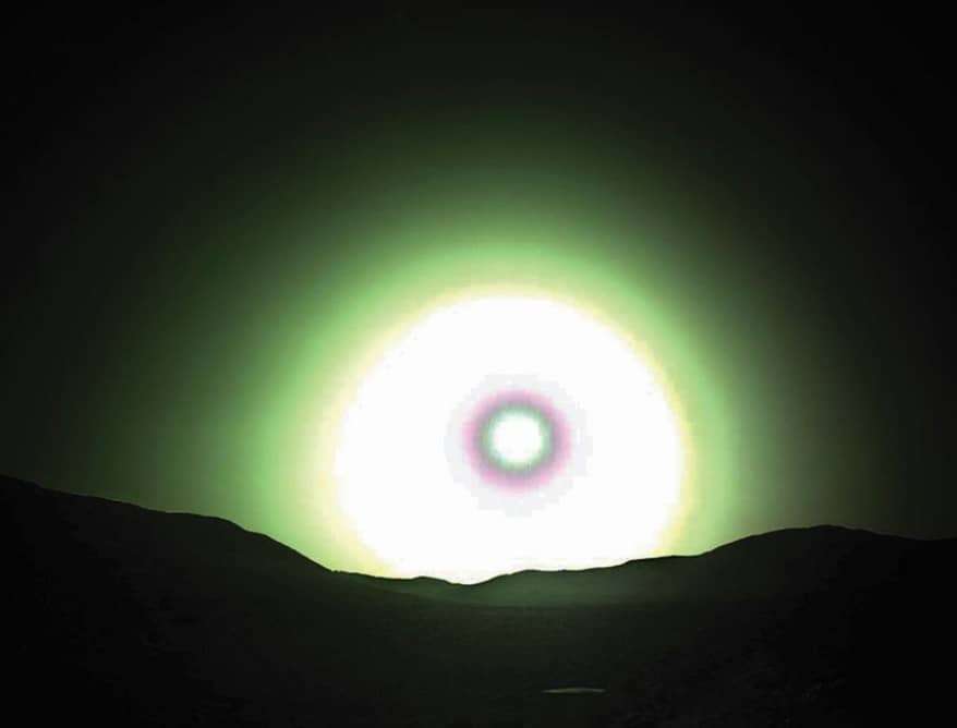 وتظهر صورة برسفرنس غروب الشمس في أفق المريخ متوهجة باللون الأخضر المزرق البارد والغريب. وهي صورة تلقي المزيد من الضوء على الفيزياء وراء غروب الشمس الغريب، وفيزياء تشتت الضوء على الكوكب الأحمر، وكيف يتناقض مع ظاهرة مماثلة على الأرض.