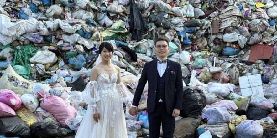 التقط ثنائي تايواني صورة غير تقليدية لزفافهما، تظهر العريس مرتدياً بزّته الرسمية والعروس فستانها الأبيض أمام مكب للنفايات، في خطوة تعبّر عن قلق العروس من تلوّث البيئة وأملها في جعل مدعوّيها يحجمون عن إنتاج نفايات غير ضرورية.