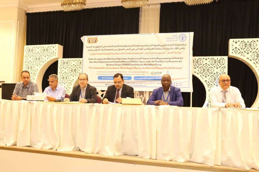 كما القيت كلمتان من قبل ممثل منظمة الفاو الدكتور وليد صالح ورئيس وحدة الثروه الحيوانية في المنظمة جاستن اوكوير أشارا فيها إلى الهدف من الورشة في مناقشة الإستراتيجية الوطنية لصحة الحيوان لتوفير الفرص لاصحاب المصلحه في قطاع الثروه الحيوانية للمساهمه في تقديم ارائهم الإستراتيجية لصحة الحيوان والتي يتم صياغتها على نتائج القدرات لموسسات الثروة الحيوانية والتي تم اجرائها مؤخراً والاجتماعات التشاورية لاصحاب المصلحة لتوفير بيئه تشاوريه واجتماعية وعملية مشاركه وتحديد أولويات ونتائج وثيقه الإستراتيجية مشيدين بالتعاون الوثيق بين وزارة الزراعة الري والثروة السمكيه ومنظمة الأغذية والزراعة.
