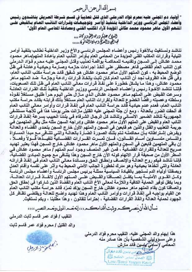 وأضاف"إننا نناشد فيكم روح العدالة والإنصاف وإحقاق الحق ومساندة معالي النائب العام في إنفاذ قراراته العادلة والتي أتخذها بحيادية وهو مدرك لخطورة الجانب الأمني المحيط به وآثر على نفسه وأقام العدل ، وبصفتنا أولياء الدم نستجير بالقيادة السياسية ممثلة برئيس مجلس الرئاسة وأعضاء مجلس الرئاسة وكل القوى الأمنية بما يكفل إنصافنا والقبض على المتهم الأول لانفاذ قرارات العدالة، وبما يكفل توفير الحماية الكافية واللازمة لمعالي الأخ النائب العام والقضاة الذين شاركوا في إحقاق الحق وانصافنا،كون بقاء المتهم ماهر محمود عكاش خارج السجن يؤكد تمرّد قائد حراسة مكتب النائب العام عن القيام بواجبه في إنفاذ قرارات وأوامر النائب العام وهذا تهديد واضح للعدالة ويقتضي تظافر كل الجهود لحماية العدالة وانفاذ القرارات القضائية ، إحتراماً للقانون ، وهذا مطلبنا ، وبكم نستغيث".