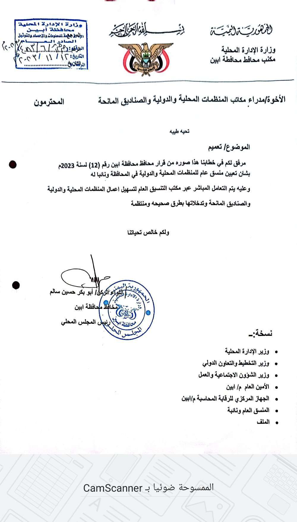 مرفق لكم في خطابنا هذا صورة من قرار محافظ محافظة أبين رقم (12) لسنه 2023 م بشان تعيين منسق عام للمنظمات المحلية والدولية في المحافظة ونائبا له وعلية يتم التعامل المباشر عبر مكتب التنسيق العام لتسهيل اعمال المنظمات المحلية والدولية والصناديق المانحة وتدخلاتها بطرق صحيحة ومنتظمة .