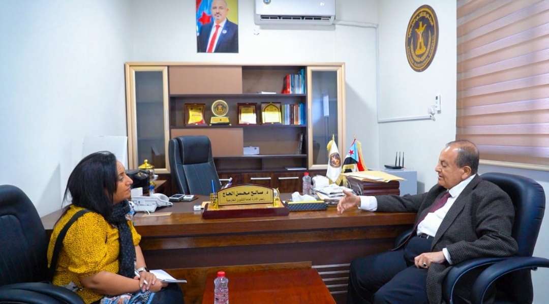 استقبل الدكتور صالح محسن الحاج رئيس الإدارة العامة للشؤون الخارجية للمجلس الانتقالي الجنوبي، يوم الخميس، في مكتبه بالعاصمة عدن، المدير الإقليمي لمركز مدنيين في ظل الصراع "سيفيك" السيدة دينا المأمون.
