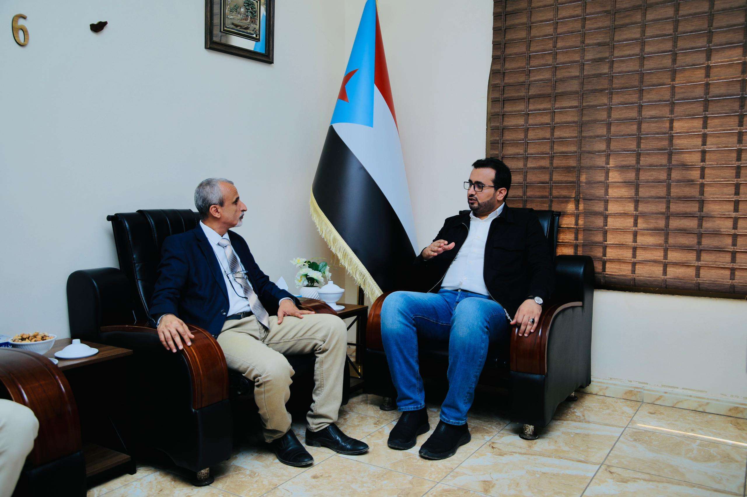 التقى الأستاذ سالم ثابت العولقي رئيس الهيئة الوطنية للإعلام الجنوبي المتحدث الرسمي باسم المجلس الانتقالي الجنوبي يوم الاثنين في مكتبه بالعاصمة عدن الدكتور سالم الشبحي وكيل وزارة الصحة لقطاع السكان رئيس لجنة الصحة والبيئة في الجمعية الوطنية للمجلس الانتقالي الجنوبي.