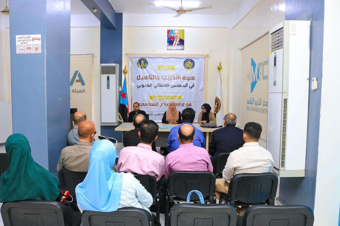 نظمت هيئة التدريب والتأهيل المساعدة لهيئة رئاسة المجلس الانتقالي الجنوبي، يوم الاثنين، في العاصمة عدن، دورة تدريبية بعنوان "الصراع السياسي"، واستهدفت كادر هيئات المجلس الانتقالي الجنوبي.