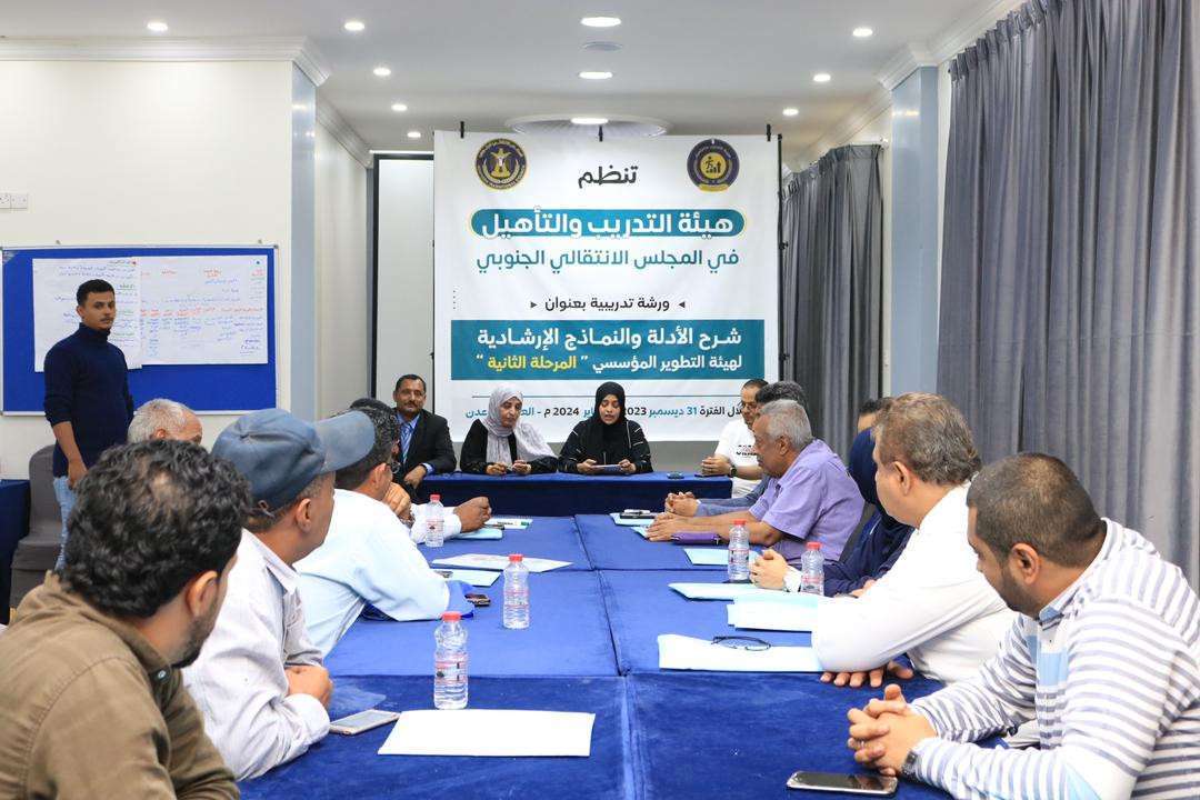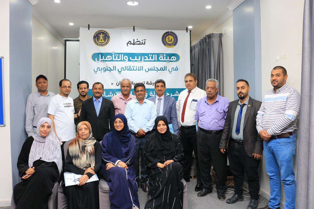 اختتمت هيئة التدريب والتأهيل المساعدة لهيئة رئاسة المجلس الانتقالي الجنوبي، يوم الأربعاء، في العاصمة عدن، ورشة تدريبية بعنوان "شرح الادلة والنماذج الإرشادية لهيئة التطوير المؤسسي - المرحلة الثانية"، واستهدفت كادر هيئات المجلس الانتقالي الجنوبي.