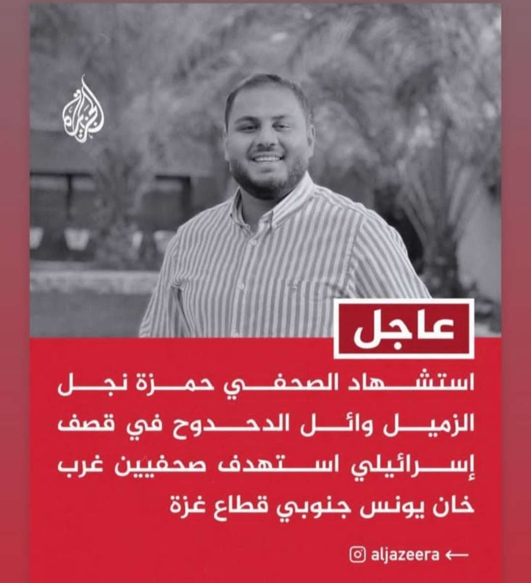 وبحسب مصادر فلسطينية، فقد قُتل في القصف الصحفيين حمزة الدحدوح ومصطفى ثريا.
