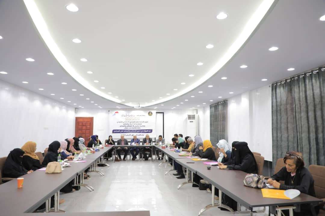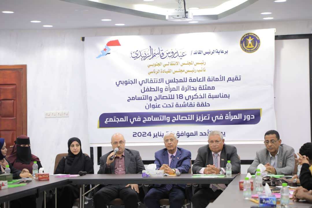 نظمت دائرة المرأة والطفل في الأمانة العامة لهيئة رئاسة المجلس الانتقالي الجنوبي، اليوم الأحد بالعاصمة عدن، حلقة نقاشية تحت عنوان "دور المرأة في تعزيز التصالح والتسامح في المجتمع".