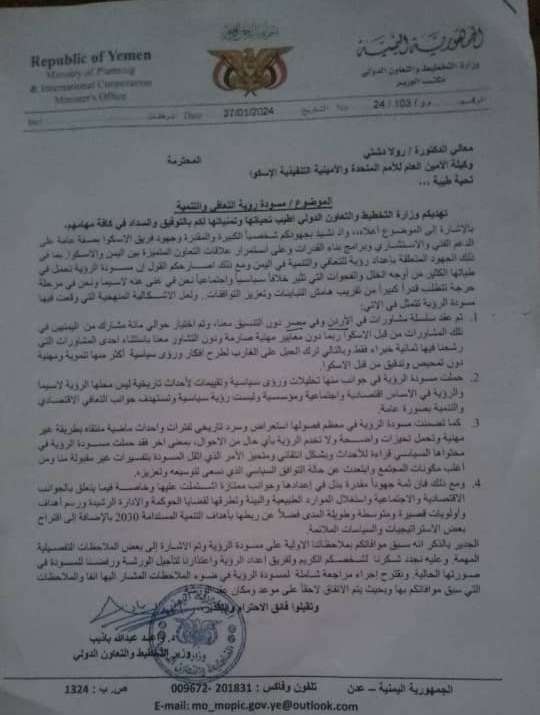 وعبر الوزير باذيب في الرسالة عن تقديره للجهود الكبيرة التي بذلتها الدكتورة وفريق الإسكوا في دعم اليمن وتعزيز التعاون المتميز بين الجانبين.