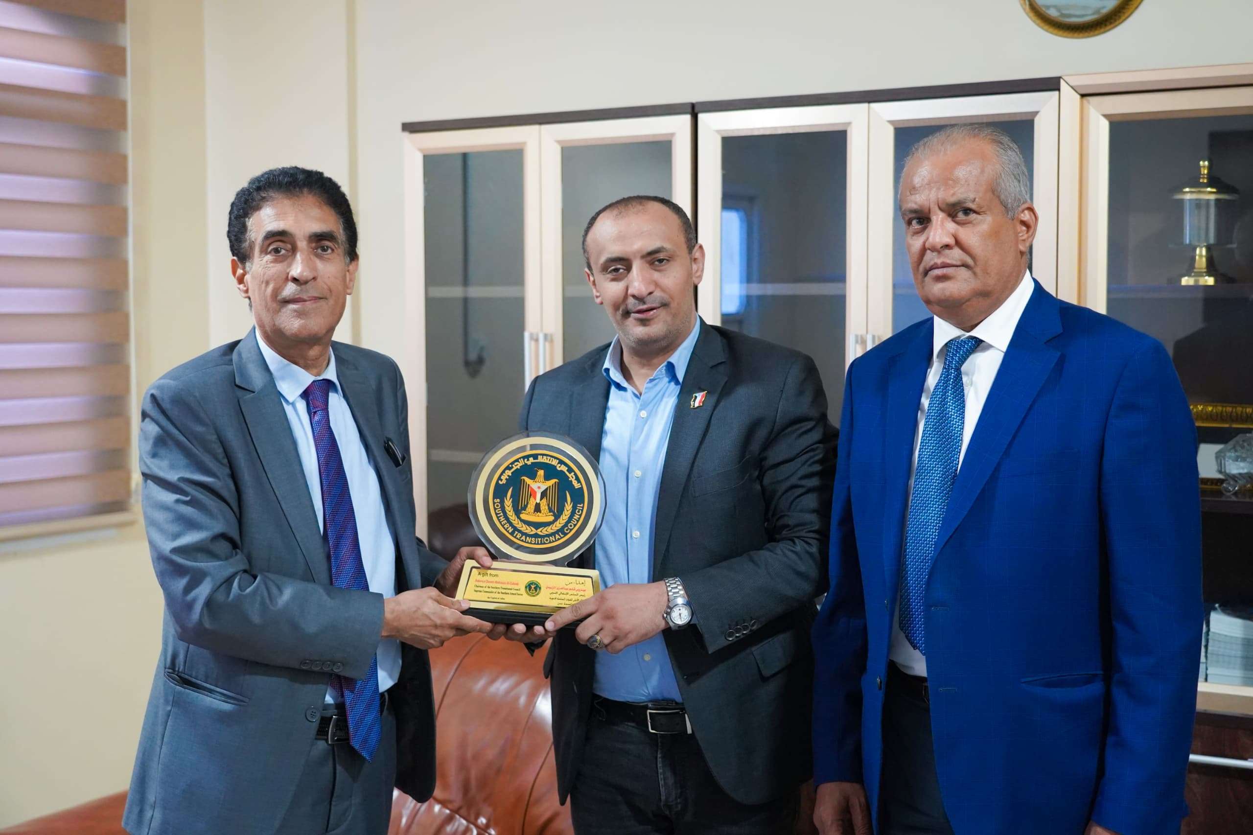 وفي ختام اللقاء، قدّم الشرفي درعا تذكاريا من المجلس الانتقالي الجنوبي للبروفسور جزوليت تكريماً له نظيراً لمواقفه الصادقة والمناصرة لقضية شعب الجنوب.