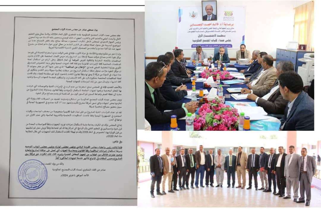 ناشد مجلس عمداء كليات المجتمع مجلس القيادة الرئاسي ورئيس مجلس الوزراء ومجلس النواب بسرعة استكمال إجراء مناقصة مشروع تجهيز عدد 12 كلية مجتمع والمقدم من الصندوق الكويتي للتنمية الاقتصادية العربية والبدأ بإجراء فوري في ردع الجهات المعرقلة للمشروع المتعثر منذ سنوات لأغراض شخصية تبنتها مراكز قوى حد وصف البيان .