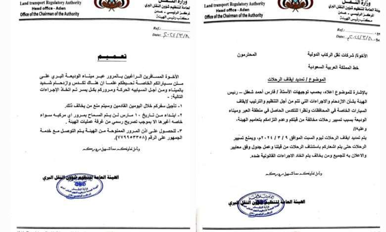 وجهت الهيئة العامة لتنظيم شؤون النقل البري بالعاصمة عدن، ، تعميماً لشركات نقل الركاب الدولية (خط المملكة العربية السعودية) بتمديد إيقاف الرحلات ليوم غد السبت، نظراً للتكدس الحاصل في منطقة العبر وميناء الوديعة بسبب تسيير رحلات مخالفة من قبل شركات النقل البري وعدم التزامها بتعاميم الهيئة، بحسب ما جاء في التعميم.