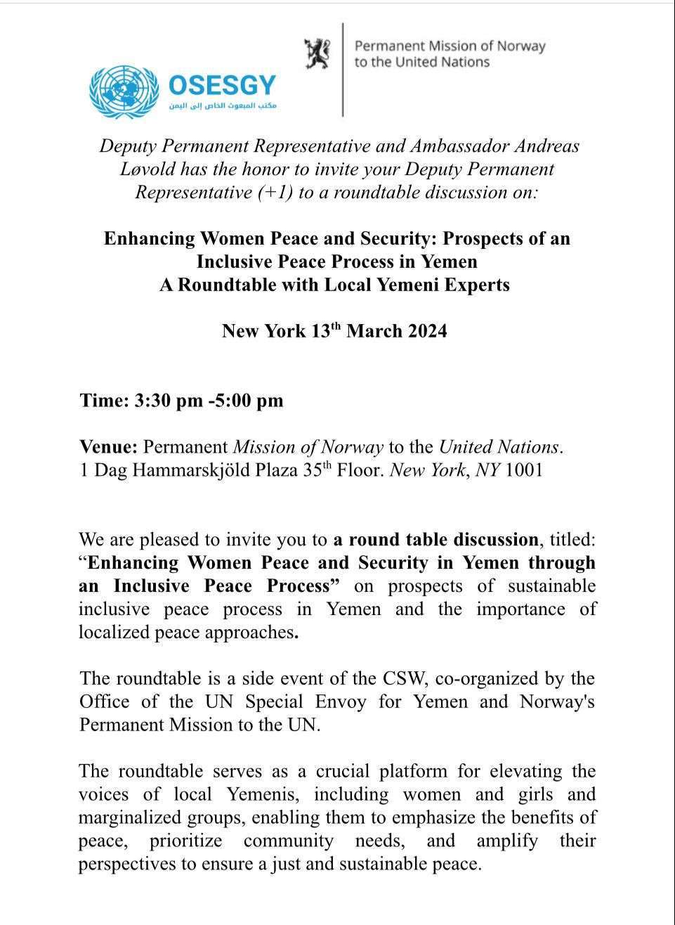 استضافت البعثة النرويجية بمقر الأمم المتحدة في نيويورك اجتماعا رفيع المستوى لمكتب المبعوث الاممي الى اليمن مع أعضاء مجلس الأمن وعدد من الدبلوماسيين، على هامش مؤتمر لجنة وضع المرأة الثامن والستين CSW68 الذي يعقد في الامم المتحدة بنيويورك.