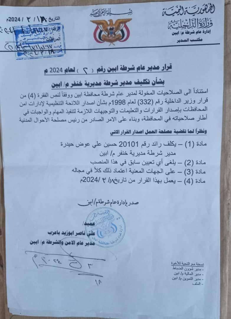 صدر اليوم قرار رقم 2 لعام 2024م عن مدير الأمن العام والشرطة بمحافظة أبين العميد ابو مشعل الكازمي قضت المادة الأولى منه بتكليف الرائد حسين علي عوض حيدره المسعودي مدير الأمن العام بمديرية خنفر محافظة أبين .