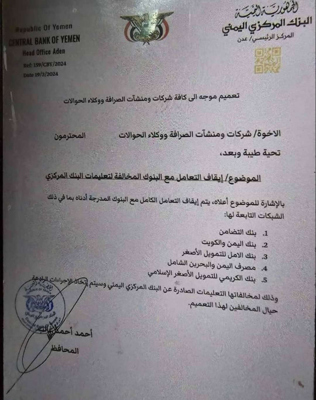 أصدر البنك المركزي اليمني اليوم، تعميم موجه الى كافة البنوك وشركات ومنشآت الصرافة ووكلاء الحوالات، ينص على إيقاف التعامل الكامل مع البنوك المخالفة لتعليمات البنك المركزي بما في ذلك الشبكات التابعة لها، والبنوك هي: