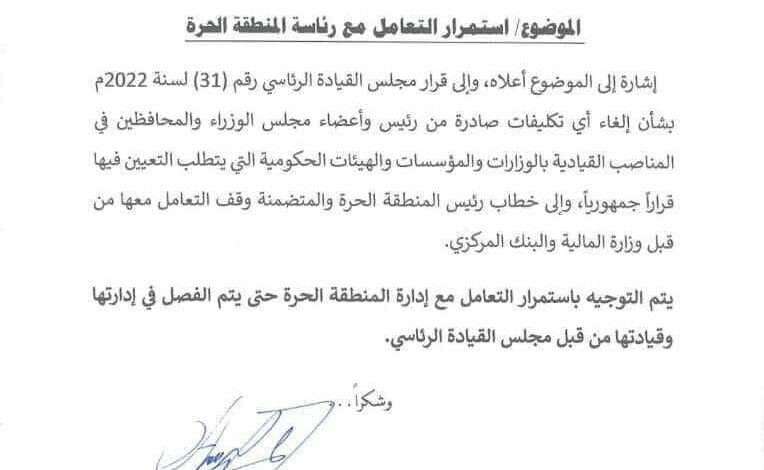 ووجه الزبيدي في مذكرة رسمية وزير المالية “باستمرار التعامل مع رئاسة المنطقة الحرة حتى يتم الفصل في ادارتها وقيادتها من مجلس القيادة الرئاسي” ، والتي يتولى الحيد حاليا رئاستها.