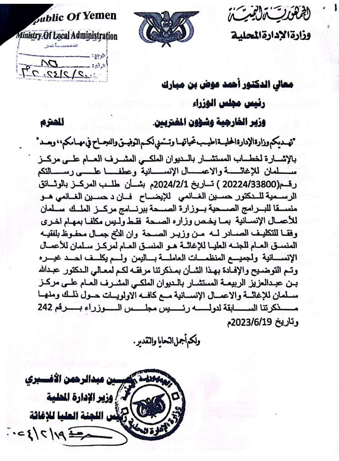 وأوضح وزير الادارة المحلية, رئيس اللجنة العليا للاغاثة خلال رسالة رد وتوضيح رفعها لرئيس مجلس الوزراء الدكتور احمد عوض بن مبارك, أشار خلالها الى ان المدعو د حسين الغانمي هو منسق الملك سلمان بما يخص وزارة الصحة فقط بموجب تكليفه من وزير الصحة وليس مكلفا كمنسق عام للجنة العليا للاغاثة.