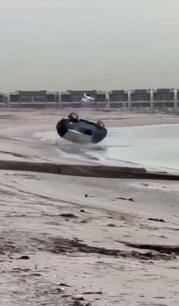 وأظهر الفيديو الشاب يحاول التفحيط على الشاطئ وهو يلمس المياه بأحد جانبي المركبة لكنه فقد السيطرة عليها وانقلب عدة مرات وطار في الهواء.
