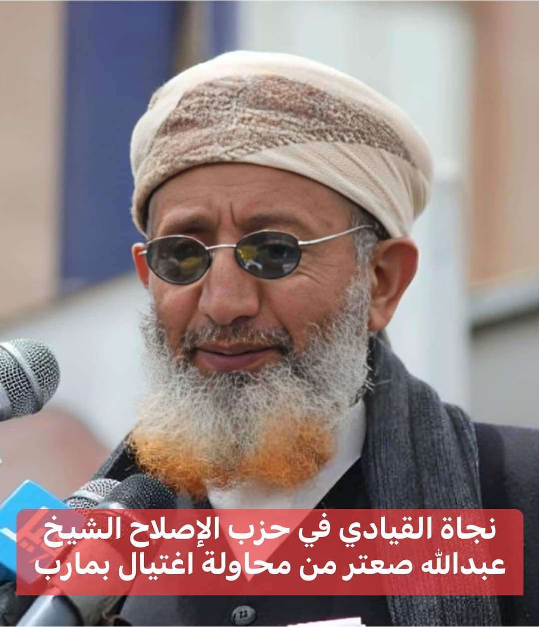 نجا الداعية وعضو مجلس الشورى في حزب التجمع اليمني للإصلاح، المهندس عبدالله صعتر، من محاولة اغتيال في ضواحي مدينة مأرب (شرق اليمن).