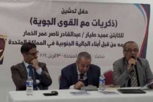شهدت مدينة شفيلد البريطانية حفل تدشين لكتاب (ذكرياتي مع القوى الجوية والدفاع الجوي) للكابتن عميد ركن طيار عبدالقادر عمر ناصر الخمار، أمس السبت، بحضور، عدد كبير من ابناء الجالية الجنوبية في المملكة المتحدة.