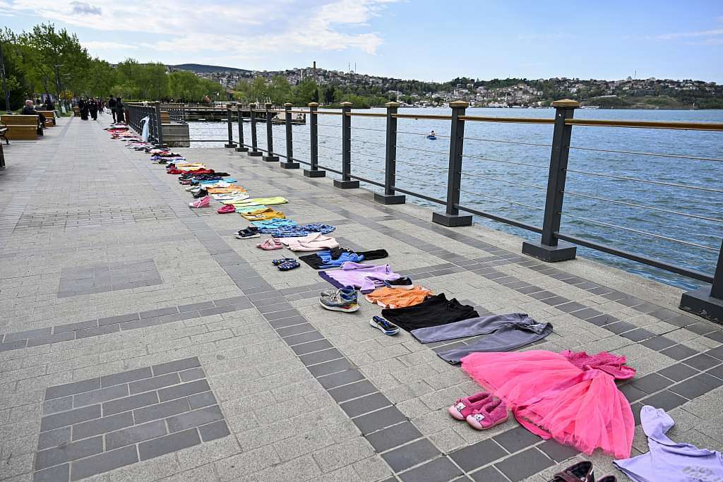 تم وضع ملابس وأحذية الأطفال على طول الخط الساحلي في إسطنبول، تركيا، أمس، احتجاجا على مقتل الأطفال الفلسطينيين على يد القوات الإسرائيلية في #غزة.