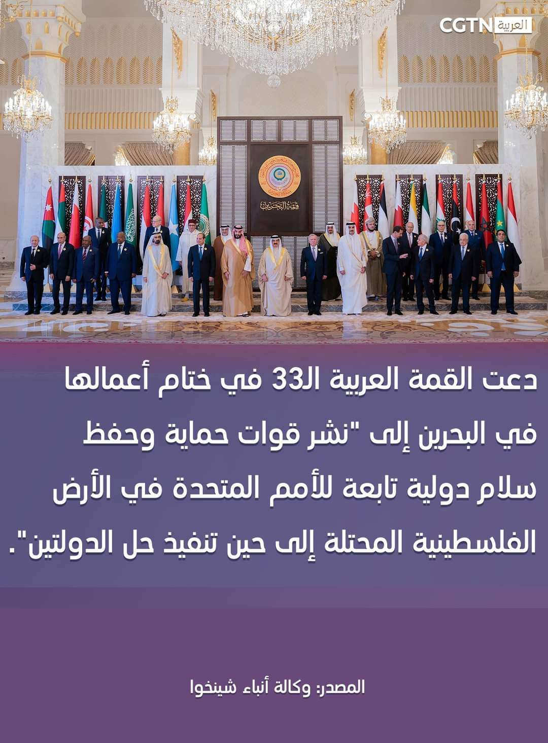 دعت القمة العربية الـ33 في ختام أعمالها في البحرين يوم الخميس إلى "نشر قوات حماية وحفظ سلام دولية تابعة للأمم المتحدة في الأرض الفلسطينية المحتلة إلى حين تنفيذ حل الدولتين".